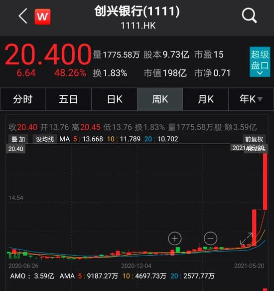 5月20日,停牌半月的港股上市银行创兴银行复牌,股价大幅暴涨近五成,一度回到5年前股价高位。截至当日收盘,创兴银行股价涨幅48.26%,报20.4港元,总市值达198亿元港元。