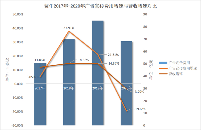 2018年-2019年,蒙牛的广告宣传费用分别增长了37.91%以及21.31%,而公司营收增速则徘徊在15%以下,2020年在减少广告宣传费用的情况下营收增速为负增长-3.79%。