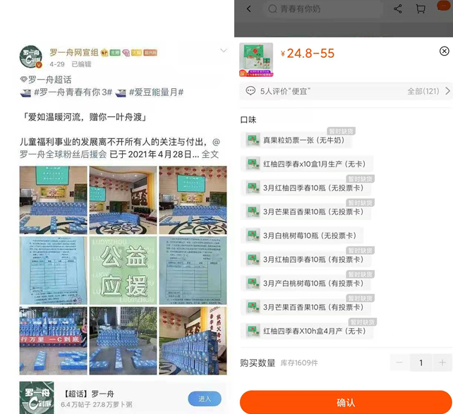 *粉丝的公益捐助及线上经销商低价售卖的无卡乳饮