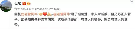 19日,但斌的好友“老曾阿牛”在其微博下留言:“君子坦荡荡,小人常戚戚,但兄乃正人君子,却长期被各种流言伤害,这就是所说的:有多大的赞誉,就会有多大的诋毁。”但斌回复时对此表示认同,抱拳点赞。