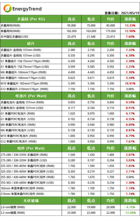 5月19日,根据硅业分会价格更新数据,国内单晶复投料最高价格来到20.0万元/吨,成交均价为19.44万元/吨;单晶致密料成交均价也涨至19.00万元/吨。这是自2020年底以来硅料第16次涨价,业内预计今年硅料价格恐将持续保持高水位。