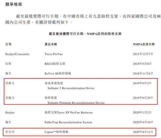 从此前心玮医疗递交的招股书中的竞争格局也显示,美敦力的取栓装置获批日期比心玮医疗只早上一年左右。也就是说,美敦力和心玮医疗研发取栓装置的时间几乎是在同一时期。