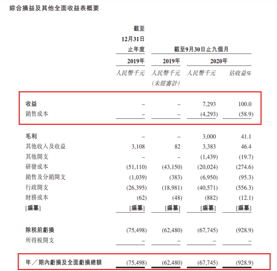 值得注意的是,心玮医疗在2020年才开始营收。招股书心玮医疗的收益一栏,仅只有截至2020年9月30日的数据,2019年同期,甚至2019年全年并没有收益和销售成本。