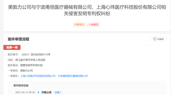 据天眼查显示,美敦力公司以侵害发明专利纠纷为由,将上海心玮医疗诉讼至宁波市中级人民法院。该案件已于5月11日开庭。