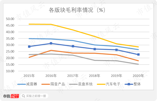 具体到各个业务上看,可以看出,减震器、隔音产品、底盘系统、汽车电子四大业务的毛利率,均有不同程度的下滑。尤其2018-2019年期间,减震器、隔音产品两个业务最为明显。