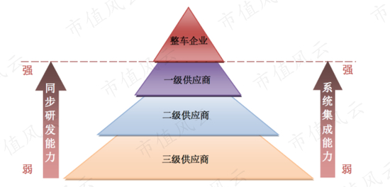 此外,在OEM市场,又可以根据配套能力的不同,将供应商分为三个层级。其中,一级供应商,具备同步研发能力、系统集成能力和系统配套供货能力,可以与整车企业直接配套,属于对能力要求最高的类别。