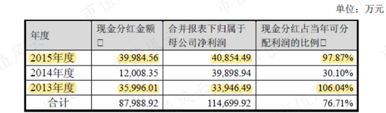 而在2013年、2015年,拓普集团各分红派现了3.60亿元、4.00亿元,对比当年各3.39亿元、4.09亿元的归母净利润,基本算是把当年的净利润全部分走了。