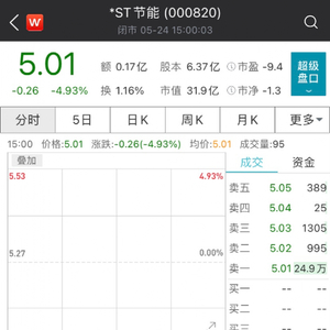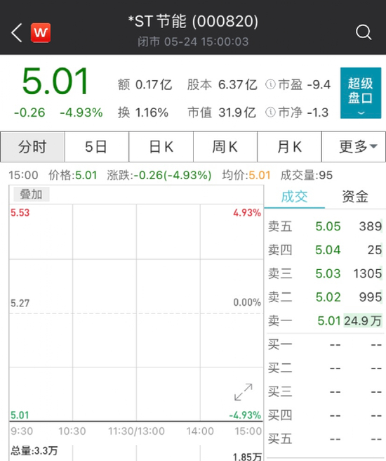 不过,*ST节能今早开盘直接一字跌停,封单近25万手。截至收盘,该股报5.01元/股,最新总市值为31.9亿元。