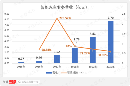 智能汽车业务的营业收入从2015年的0.27亿大涨至2020年的7.7亿,复合增速高达95.45%,表现堪称惊艳。