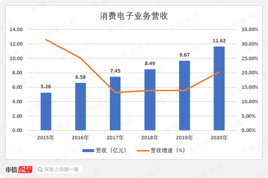 消费电子业务从2015年的5.26亿上升至2020年的11.62亿,复合增速为17.18%,低于整体增速。