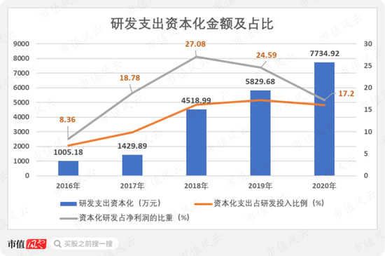 但研发资本化金额可不算低:2020年达7734.92万,资本化支出占研发投入的比例在2018年后维持在16%左右,而资本化研发支出占当期净利润的比重在2018年和2019年分别达到27.08%和24.59%。