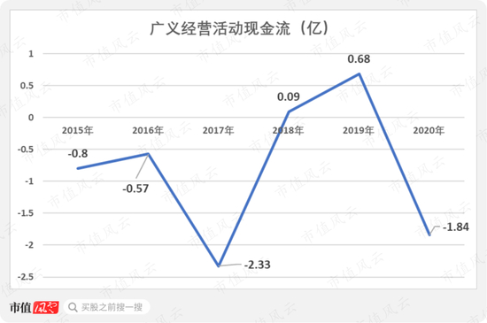但公司的经营性现金流净额难以覆盖公司的投资活动,仅2018年和2019年的广义经营活动现金流为正数,2015年至今广义经营活动现金流累计净流出4.77亿,表明公司吭哧吭哧地干了好几年,发现账上根本没几个钱,只能向市场伸手要钱。
