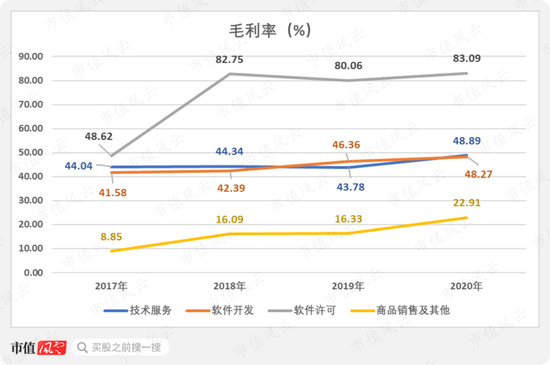 软件许可主要是公司自有IP授权给客户使用,边际成本极低,因此获得符合软件企业的毛利率,自2018年起稳定在80%以上。