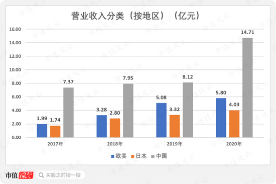 公司的客户遍布全世界,欧美地区的营收从2017年的1.99亿上升至2020年的5.8亿,日本则从1.74亿上升至4.03亿,增幅均高于国内营收。