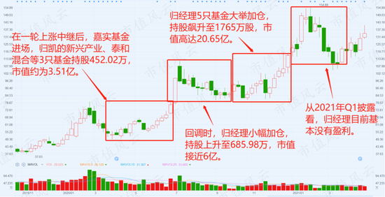 归经理是在2020年Q2,中科创达股价相比低位接近翻倍时开始进场,管理的3只基金持有452.02万股,市值约为3.51亿,一直在Q4的股价高位才大举加仓。