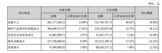 从营业成本构成看,以2019年和2020年为例,直接人工成本分别高达5.14亿和8.06亿,占比分别达49.02%和54.96%。
