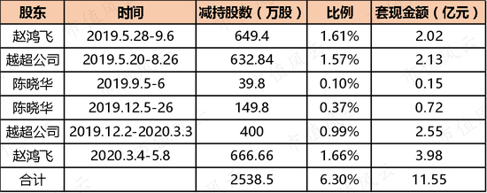 自2018年12月IPO股份全部解禁后,实控人赵鸿飞和时任第二大股东越超公司开始大手笔减持,在2019年内就合计减持了4.15亿,随后在2020年再次出手减持了6.53亿。