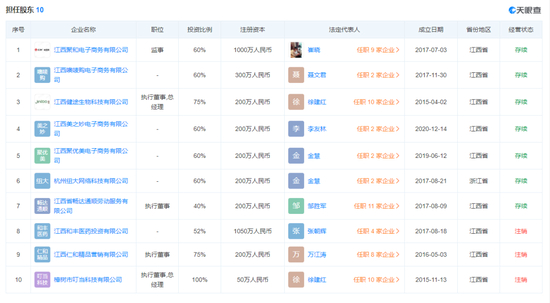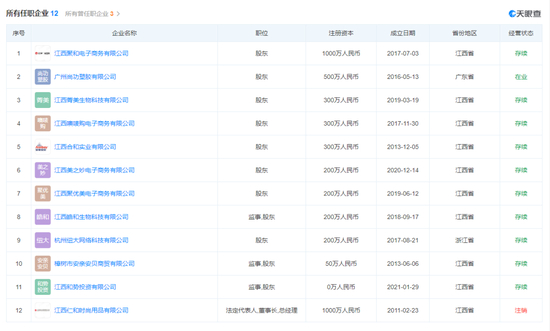 同时,江西聚和电子商务有限公司(简称“江西聚和”)二股东黄谊东有出任仁和集团控股公司仁和时尚董事长、总经理及法人的记录。不过,天眼查显示,这家公司已经注销。