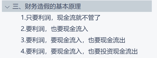 按照初善君的总结,财务造假就四种,表面是虚增资产,背后是现金流的不同,包括只要利润不要现金流、要利润也要现金流入、要利润要现金流入也要经营现金流出、要利润要现金流入也要投资现金流出。