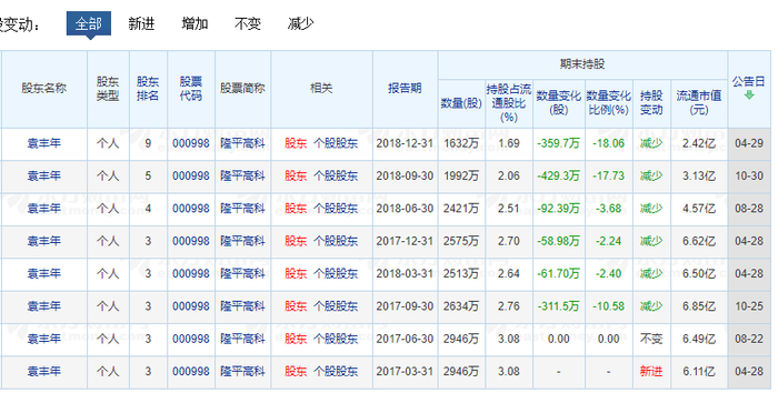2014年1月10日,袁丰年成为隆平高科第四大股东,持股1472.78万股,参考市值3.64亿元。到2014年年末,该部分股权市值达到5.8亿元,袁丰年2017年开始减持,并在2018年年末退出前十大股东,持股市值一度达到6.85亿元。