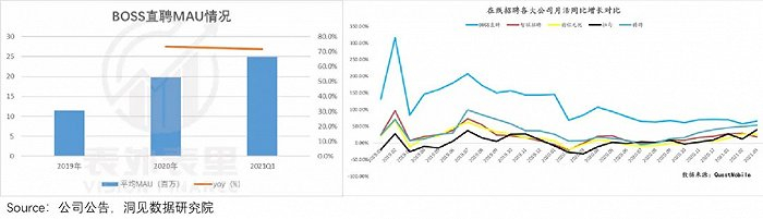 营销宣传到位下,2020年BOSS直聘平均MAU为1980万,同比增长73.2%。同时QM数据显示,过去一年,平台月活同比增速始终保持行业领先。