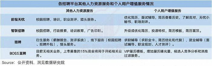 比如前程无忧、智联和猎聘,均在企业端的其他人力资源服务和个人用户增值服务方面,进行新产品业务线开拓。