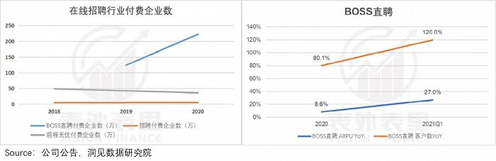 招股书显示,2020年,BOSS直聘经过验证的企业数达到1140万,同比增长76.6%;其中付费企业数为223万,同比增速达80.1%;2021Q1,BOSS直聘客户数同比增长率更是达到120%。即便如此,从大盘上看,也还有超过一半的企业现在是免费使用BOSS直聘。