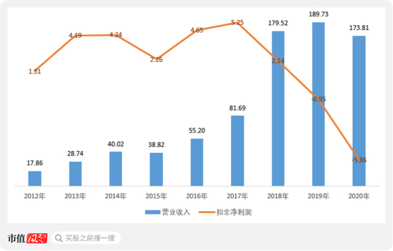 2020年,木林森营业收入173.81亿元,同比下滑8.39%,扣非归母净利润-5.86亿元,扣非亏损进一步扩大。