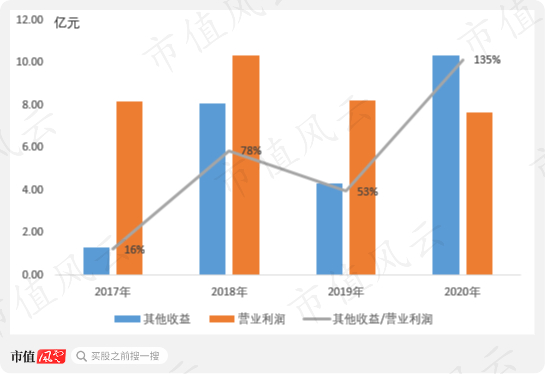 计入其他收益的产业发展补助已经成为木林森近3年主要利润来源。2020年其他收益高达10.35亿元(其中政府补助9.98亿元),营业利润贡献更是超过100%。