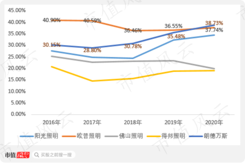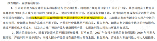 但也不全是坏消息,2020年,木林森首次披露朗德万斯品牌毛利率,38.73%,历史新高。这个毛利率已经高于欧普照明2020年毛利率,而后者在A股所有照明业务上市公司中毛利率最高。