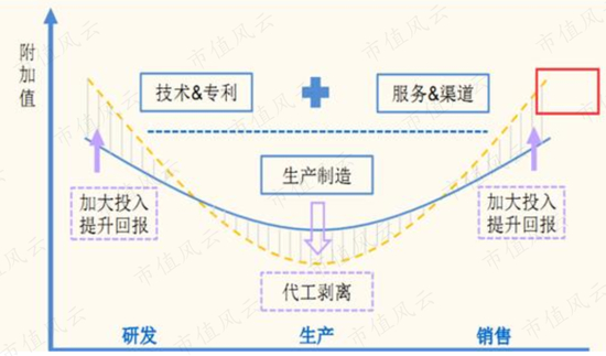 在产业链中,附加值更多体现在两端——设计和销售,处于中间环节的制造环节附加值最低。