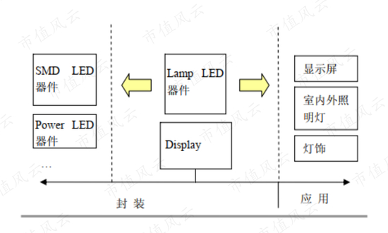 LED产业链包括上游衬底和外延片、中游芯片制造以及下游封装及应用。由于上游和中游较高的技术壁垒,因此发展早期,国内企业大多在下游封装及应用领域竞争,再设法逐渐向上游产业链渗透。
