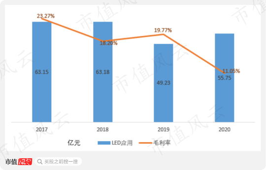 而木林森原有的LED封装业务(即下图的LED应用业务)营收和毛利率也不同程度下滑。