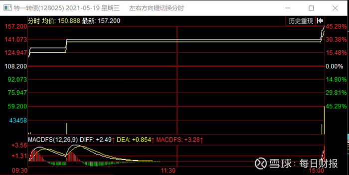 公告发布之后,特一药业股价连续两日涨停。比起股价,特一转债的涨势更是让人瞠目结舌,甚至出现单日暴涨45%的“奇迹”。上述公告发布当日,特一转债开盘大涨,随后触及20%盘中熔断红线,不得不停牌30分钟;复盘后,特一转债仅有一笔交易便触及30%熔断红线。尾盘结束后统计,仅用5笔交易,特一转债单日便涨了45%。