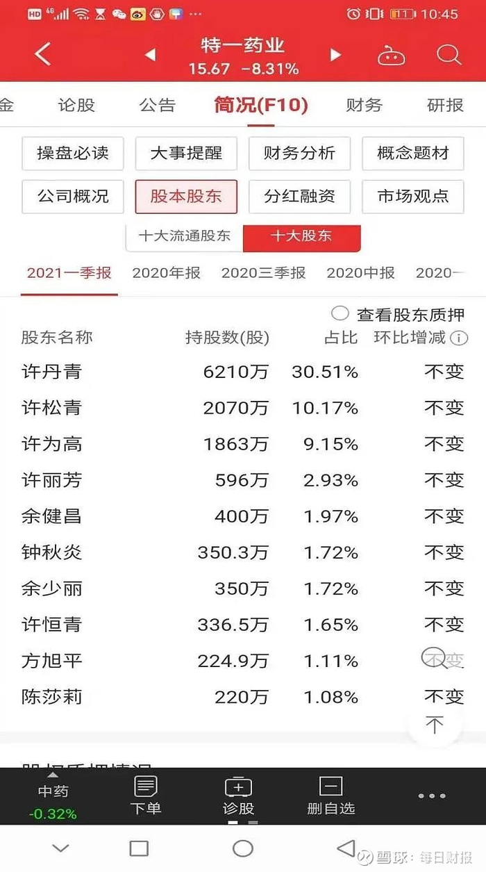 在特一药业的十大股东中,许为高和许丽芳为夫妻关系,共持股2459万股,占总股本的12.08%;许丹青、许松青、许恒青为两人子女,共持股8616.5万股,占总股本的42.33%。上述关系人共持有特一药业股份54.41%,超过一半的股份集中在许氏家族手中。可能由于股份过于集中,特一药业十大股东及十大流通股东未见机构持股。
