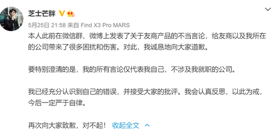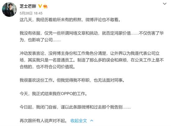 @芝士芒胖 发微博:我没有依据,仅凭一些所谓网络文章和挑动,就否定鸿蒙价值,不仅伤害了华为,也影响了公司。冲动发表言论,没将博主身份和工作角色分清楚,让外界以为我是代表公司立场,其实我只是一名普通员工。今天,我正式结束我在OPPO的工作,跟所有人说声对不起。