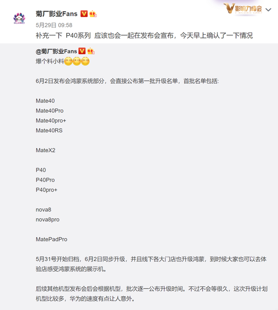据 @菊厂影业Fans透露,华为6月2日发布会上会公布鸿蒙系统第一批升级名单,6月2日同步升级,后续再逐步公布各批次升级时间。首批名单包括:Mate40、Mate40 Pro、Mate40 Pro+、Mate40 RS、Mate X2、nova8、nova8 Pro、MatePad Pro、p40、p40pro、p40pro+。