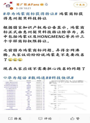 不过,近日微博博主 @看山的叔叔称,华为把鸿蒙商标买过来了。数码博主 @菊厂影业Fans也透露了相关信息,他表示华为鸿蒙商标获得了惠州契贝科技转让。