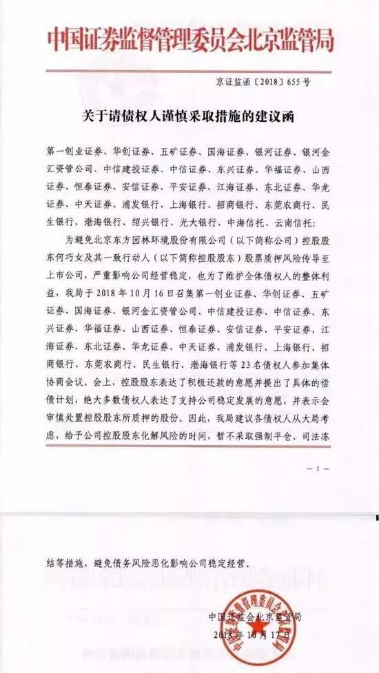 2018年10月16日,北京市证监局召集第一创业证券、浦发银行等23名债权人参加集体协商会议,这是北京地方金融监管部门首次为一家上市公司的财务情况组织债权人会议。