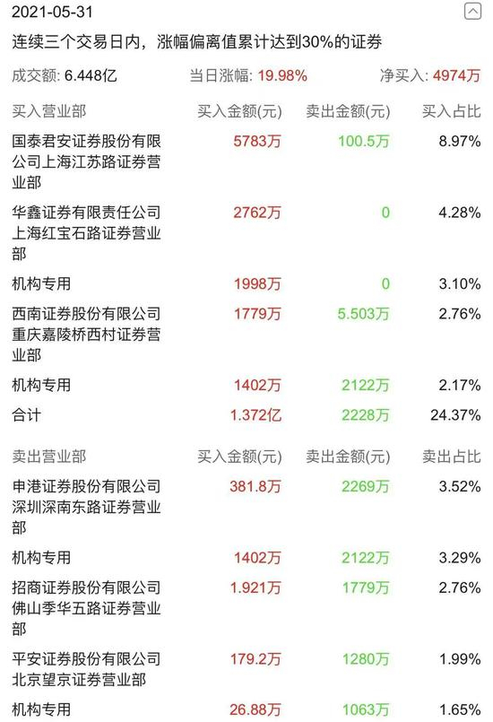 5月31日,佳沃股份继续涨停。章建平高位加仓,买入1692万元,位列买入榜榜首;华鑫证券上海红宝石路紧跟章建平步伐,在28日买入1689万元的基础上,加仓1073万元;一机构专用席位则开始大量套现,卖出1474万元,位居卖出榜榜首。