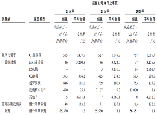 招股书显示,受益疫情的因素,公司的CT扫描仪销售数量从2018年的535台增加至2020年的767台,不过平均售价从同期183.75万元/台下降至168.54万元/台。