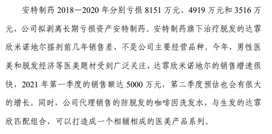 振东制药6月1日晚公告,公司决定终止剥离安特制药。原因简单粗暴:原来老亏损,现在它治疗脱发的产品卖得太好了,还是医美概念,决定继续留着它!同时,振东制药还宣布,要打造一个防脱发的医美系列产品。