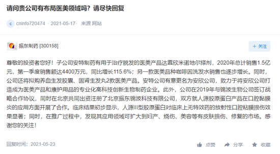 短短几个月,一切却发生了反转。振东制药表示,安特制药旗下治疗脱发的达霏欣米诺地尔搽剂前几年销售差,不是公司主要经营品种。今年,男性医美和脱发经济等医美题材受到广泛关注,达霏欣米诺地尔的销售增速很快,2021年第一季度的销售额达5000万元,第二季度预估也会有很大的增长。同时,公司代理销售的防脱发的咖啡因洗发水,与生发的达霏欣匹配组合,可以打造成一个相辅相成的医美产品系列。