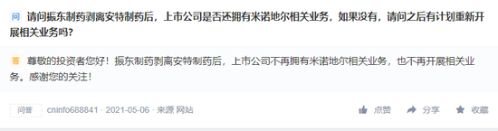 5月6日,振东制药曾在互动易回复投资者提问时表示,剥离安特制药后,上市公司不再拥有米诺地尔相关业务,同时表示将不再开展相关业务。