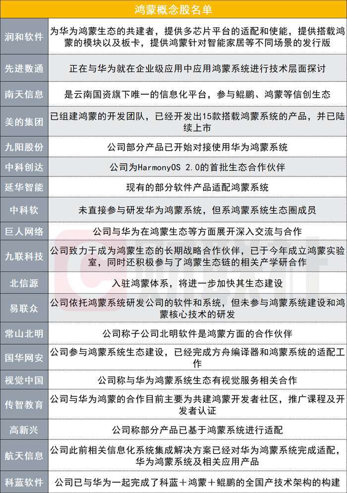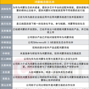 国海证券则建议把握鸿蒙2.0操作系统大规模推送前的投资机会,推荐与鸿蒙操作系统有关的企业:中科创达、科大讯飞、诚迈科技、中国软件国际、润和软件、四维图新等。