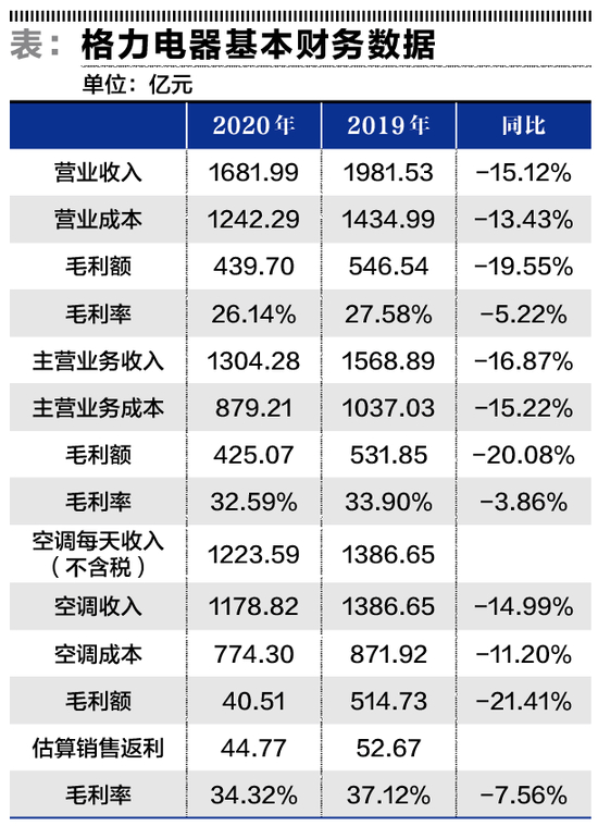 格力电器2020年营业收入1681.99亿元,2019年营业收入1981.53亿元,同比下降15.12%。销售返利在新旧收入准则的会计差异应该是原因之一。