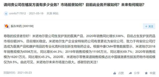 在投资者互动平台上,振东制药从5月下旬开始就逐渐难掩对米诺地尔的“溢美之词”。