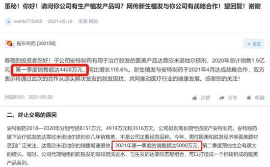 一周前,振东制药在投资者平台中称,“子公司安特制药有用于治疗脱发的医美产品达霏欣米诺地尔搽剂,2020年总计销售1.5亿元,第一季度销售额达4400万元,同比增长115.6%。”而在6月1日的公告中,振东制药披露,“今年,男性医美和脱发经济等医美题材受到广泛关注,达霏欣米诺地尔的销售增速很快,2021年第一季度的销售额达5000万元,第二季度预估也会有很大的增长。”