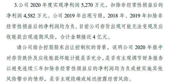 对此,深交所关注函要求,结合控股股东出让控制权的背景,说明公司2020年年报中对存货跌价及应收账款坏账计提是否充分,是否有主观调节财务报告以避免连续三年扣除非经常性损益后的净利润均为负或被实施其他风险警示的情形,是否主观隐瞒或延迟披露经营风险等。