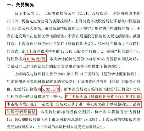 事实上,半个多月前,即5月13日,上海鸿孜与杭州科立签订《股份转让框架协议》,当时拟定的股权转让价格为 5.32元/股。